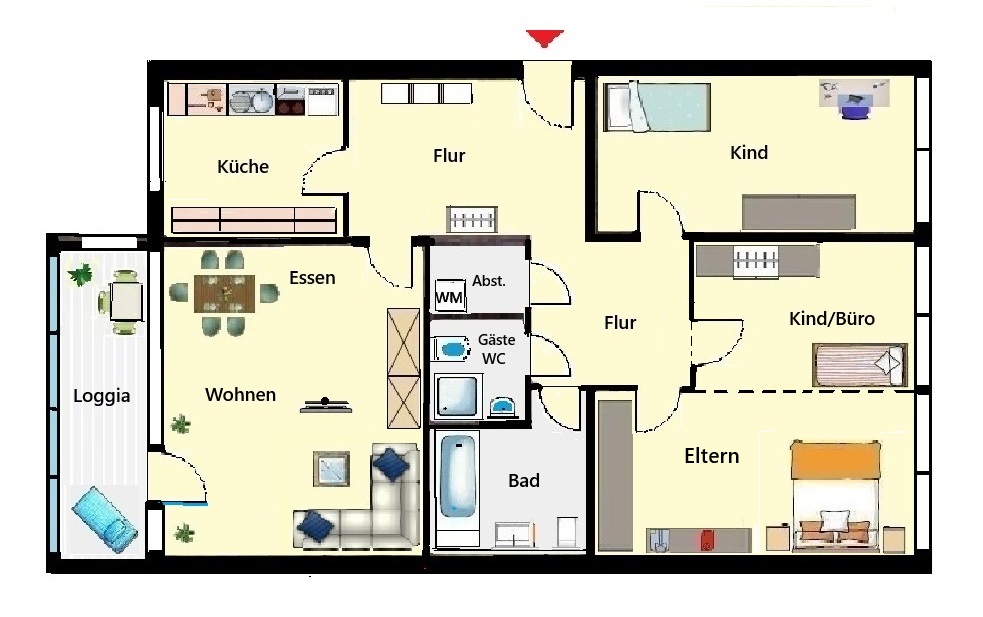 Durch einen Eingangsbereich mit Sicherheitszone gelangt man in den hellen, geschmackvollen Empfangbereich, wo man sich auch bei Bedarf auf den Sitzmöbeln kurz hinsetzen kann. Über ein Treppenhaus oder die Aufzugsanlage gelangt man auf eine großzügige Wohnetage im 2. OG und zu der Wohnungstür. Hier befindet sich ein großer Flurbereich mit Platz für eine Garderobe. Rechts sind ein Küchenraum mit Fenster und daneben liegt das großräumige, Taglichthelle-Wohnzimmer von ca. 24,5 m² Wohnfläche mit Fenstertür zur angebauten Loggia mit Schiebefenstern und einem tollen Ausblick zum nahgelegenen Rhein. Links des Flures liegen ein Eltern-Schlafzimmer, ein Kinderzimmer, ein Badezimmer, ein weiteres Kinderzimmer/Büro, ein Gäste-WC und ein Abstellraum. Zu der Wohnung gehören ein eigener Kellerraum, ein Wasch.- und Trockenraum im Untergeschoss und ein eigener Tiefgaragenstellplatz im Erdgeschoss mit direktem, gesicherten Zugang zum Gebäude. Für Ihre aktive Gesundheit befindet sich in dem Dachgeschoss, welches Sie mit einem Aufzug erreichen können, ein ca. 4,50 m X 10 m privates Schwimmbad mit Saunabereich und einer Ruheterrasse mit Weitblick über die Dächer von Porz bis zum Kölner Dom.