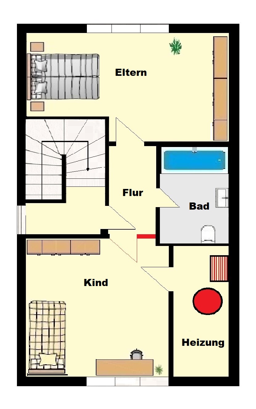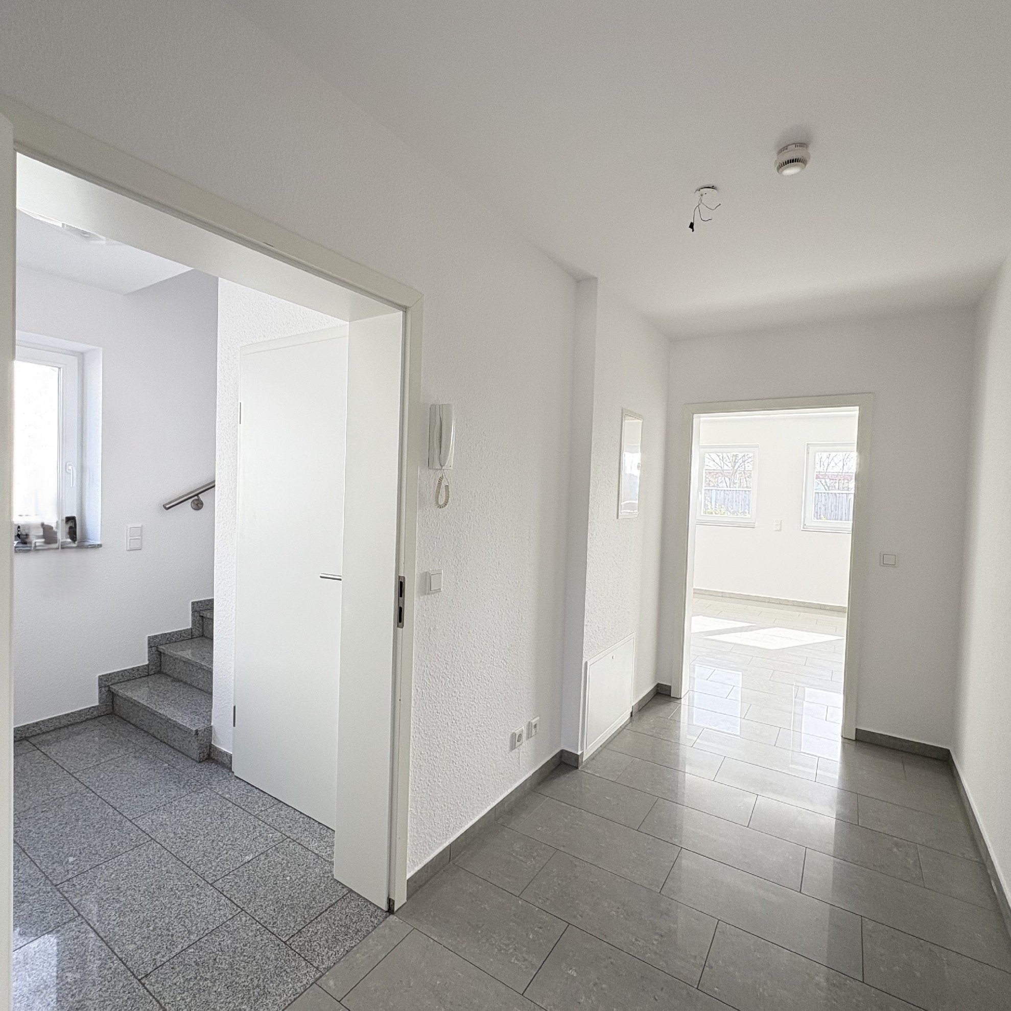 Durch die Haustür gelangen Sie in den Hausflur, von dem aus Sie Zugang zur Wohnung 1 im Erdgeschoss sowie zur Maisonette-Wohnung 2 im Obergeschoss haben. Unter der Treppe im EG befindet sich der Hausanschlussraum.