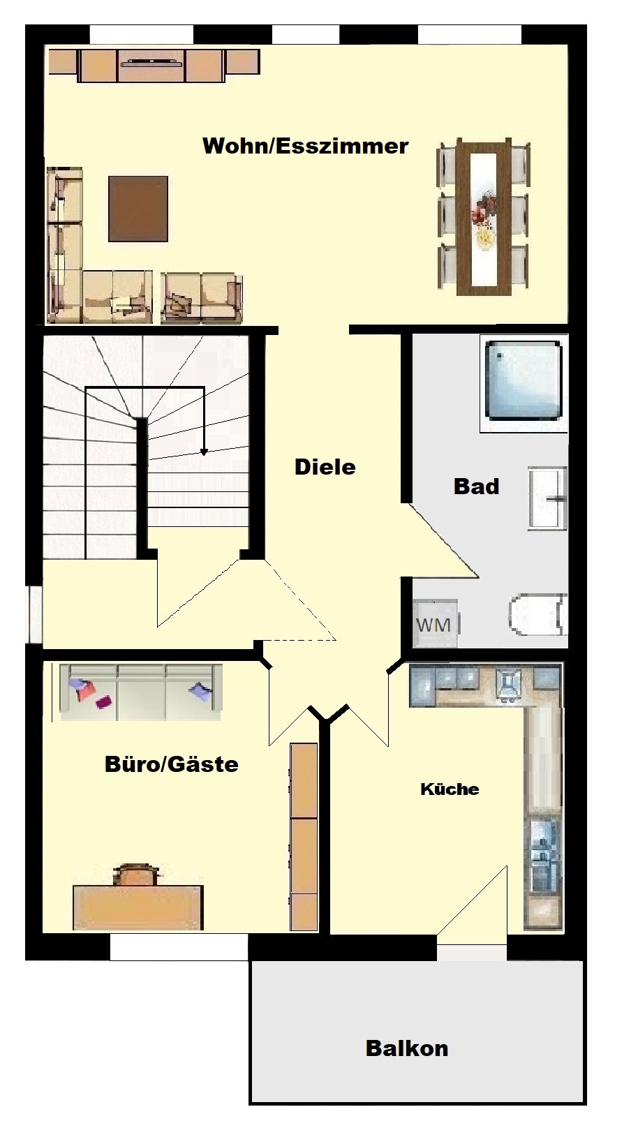 – je Etage ein Badezimmer (EG: Duschbad, OG: Duschbad, DG: Wannenbad)